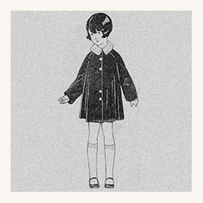 Der englische Mantel, der von den Gehrockmänteln des späten 18. Jahrhunderts inspiriert wurde, hält seit den 1880er Jahren einen bedeutenden Einzug in die Kindergarderobe. Die Taille, die am Rücken durch ein Martingal markiert wird, und die Knopfleiste mit kleinen runden Knöpfen, die mit Samt überzogen sind, sowie die Verzierungen am Hemdkragen und an den Manschetten verleihen ihm einen zeitlosen Stil.